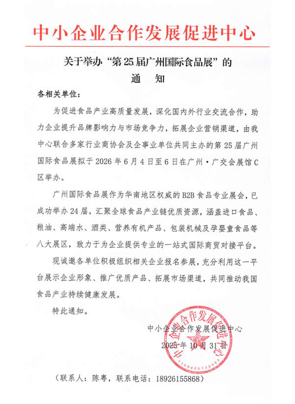 广州国际食品展作为华南地区权威的B2B食品专业展会,已成功举办24届,汇聚全球食品产业链优质资源,涵盖进口食品、粮油、高端水、酒类、营养有机产品、包装机械及孕婴童食品等八大展区,致力于为企业提供专业的一站式国际商贸对接平台。现诚邀各单位积极组织相关企业报名参展,充分利用这一平台展示企业形象、推广优质产品、拓展市场渠道,共同推动我国食品产业持续健康发展。